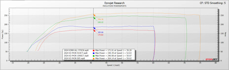 From the outset, our goal was to make it easy and relatively inexpensive to add substantially more power to your 2024 Can-Am X3. The P43R-325 turbo kit utilizes the same injectors and fuel pump as our 2024 X3 big injector packages, so these components are reused. Only head studs, plenum clamp, race intercooler and clutching are needed to complete the kit. This package produces 325 crank horsepower on E85, which is about 125 more than stock. This life-changing power increase is delivered instantaneously thanks to the P43R’s quick spool design. Additionally, the turbo has a ton of overhead to make up to 420+ crank horsepower with an engine build and other supporting components.