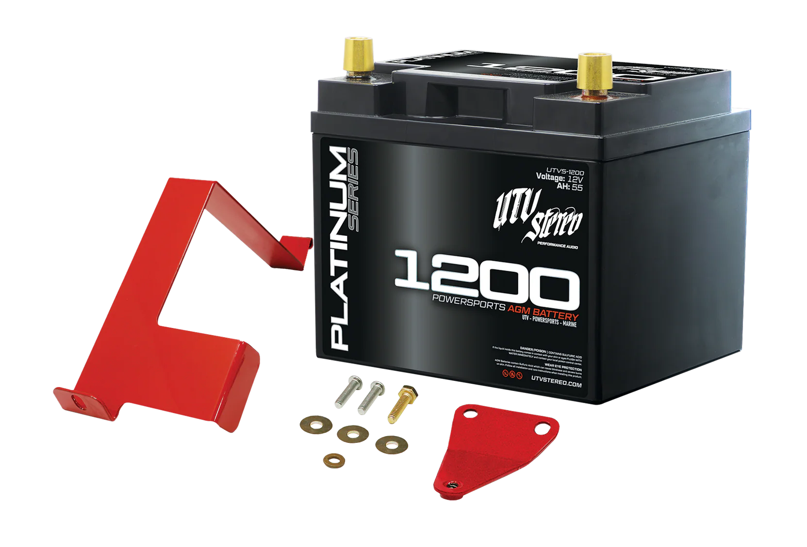 Upgrade your OEM starting battery with our Can-Am X3 BIG battery kit. This kit includes a UTV Stereo UTVS1200 AGM battery with a custom mounting bracket. The UTV Stereo UTVS1200 has more than double the cold cranking amps over the OEM battery. This kit is built for a driver who wants to keep more than enough power running through their accessories DURING their rides.